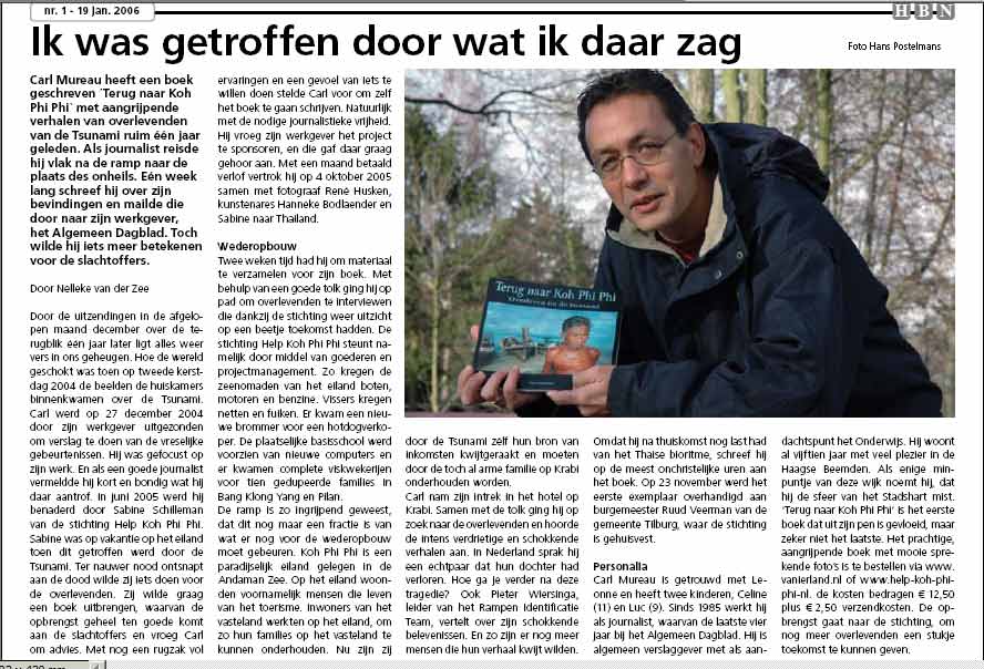 Alweer een half jaar schrijf ik maandelijks artikelen voor het Haagse Beemdennieuws, een wijkkrant met een oplage van 11.000ex. Naast het schrijven maak ik voor andere redacteuren van de wijkkrant foto's voor bij hun artikelen. Enige weken geleden maakte ik deze foto van Carl Mureau voor een artikel van een collegaredacteur. Carl ken ik al enkele jaren via deze zelfde wijkkrant waar hij toendertijd voorzitter van was. Carl is journalist bij het Algemeen Dagblad. In december 2004 is Carl uitgezonden naar Indonesie om de Tsunami-ramp te verslaan voor het AD. Een jaar na de ramp besloot Carl met enkele mensen terug te gaan naar het getroffen gebied. Over deze reis schreef hij het aangrijpende boek 'Terug naar Koh Phi Phi'. De opbrengst van het boek komen geheel ten goede aan de slachtoffers van de Tsunami-ramp.